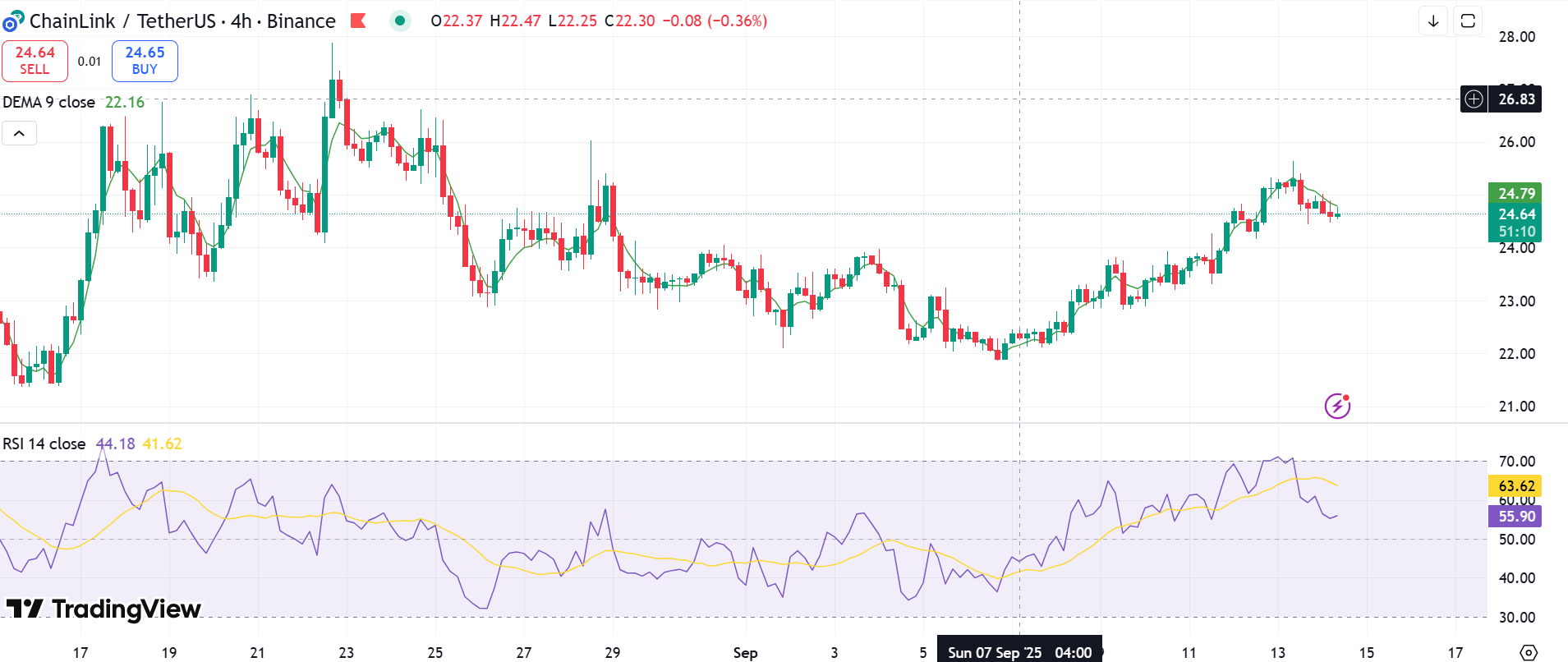 200 EMA (Daily): LINK trading above — bullish long-term signal.